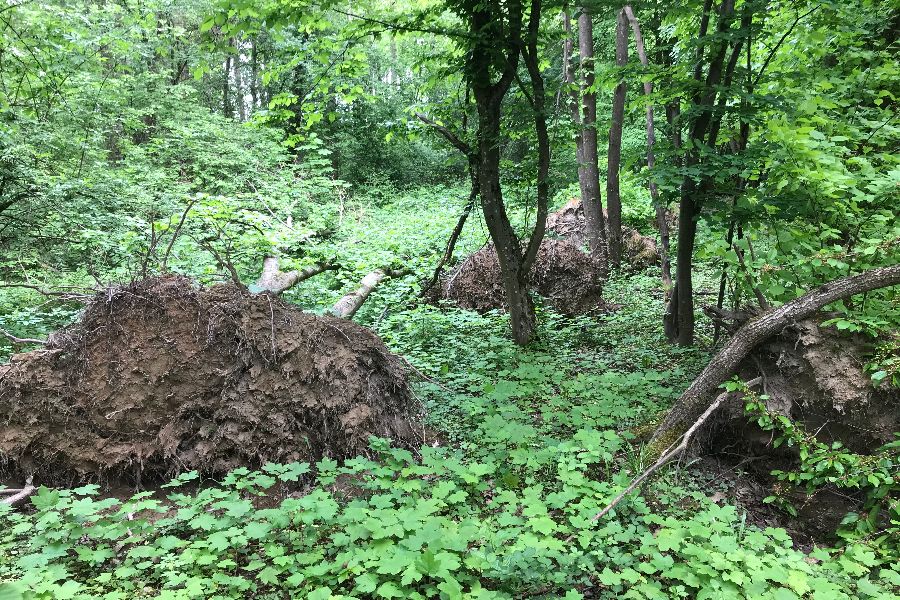 Da diese Fläche ein hohes Gefahrenpotential darstellte, erfolgte die Aufarbeitung vollmechanisiert bei trockenem Wetter. Dadurch konnten Schäden am dort besonders befahrungsempfindlichen Boden vermieden werden. Die Eichenfläche hingegen wurde motormanuell durchforstet, die gefällten Bäume wurden als Totholz an Ort und Stelle belassen.